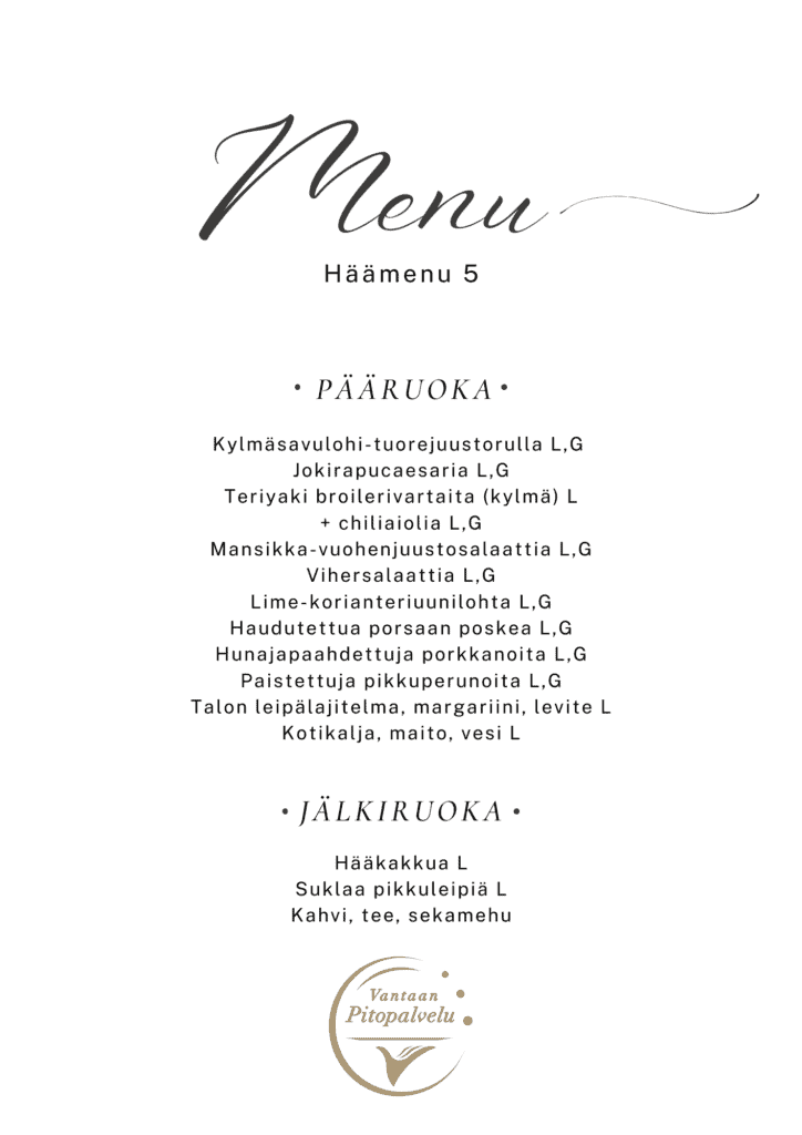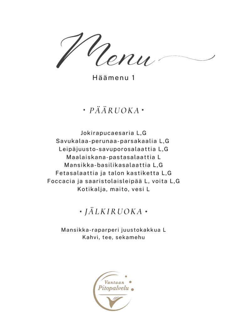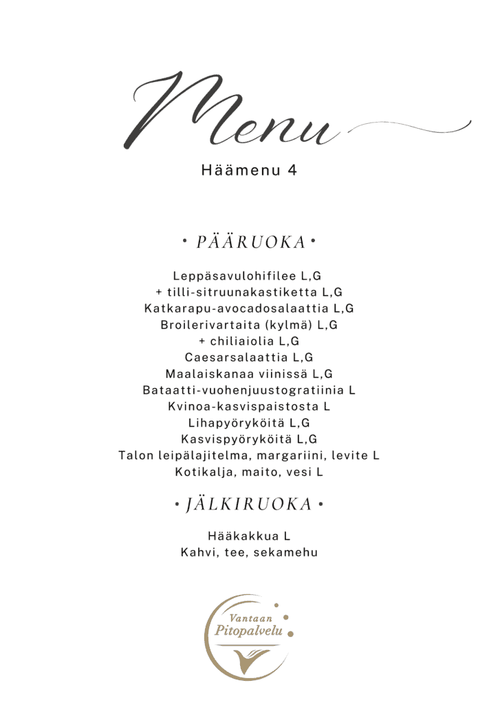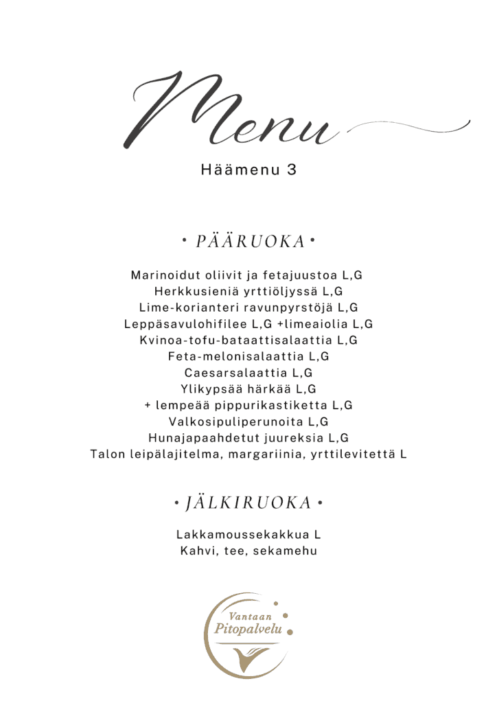 Huolehdimme siitä, että kaikki vieraat voivat nauttia juhla-ateriasta huoletta. Tarjoamme gluteenittomia, laktoosittomia ja muita erityisruokavalioihin sopivia vaihtoehtoja, kuten vegaanisia ja kasvisruokia. Ilmoitathan meille vieraiden ruokarajoitteet hyvissä ajoin, niin voimme suunnitella herkulliset ja turvalliset tarjoilut kaikille.