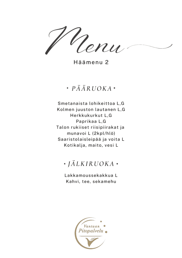 Laskurimme avulla voit helposti arvioida, millainen kokonaisuus sopii budjettiis. Laskurimme on laskettu valmiiden häämenukokonaisuuksien pohjalta. Mikäli toivot muutoksia menuun tai haluat räätälöidyn kokonaisuuden, pyydä meiltä henkilökohtainen tarjous. Pääset tutustumaan valmiisiin menukokonaisuuksiin alta.