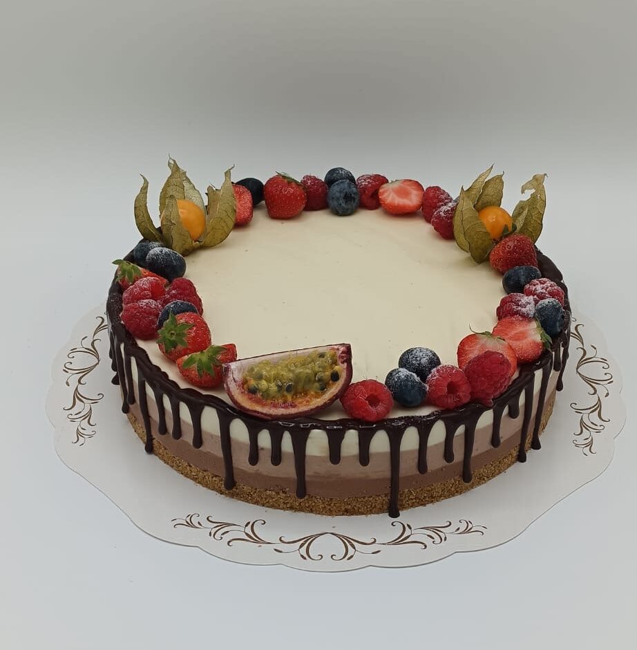 Juhlava kolmen suklaan juustokakku. Saatavilla 15 – 25 henkilölle. Valitse koko ja haluamasi noutopäivä kalenterista.